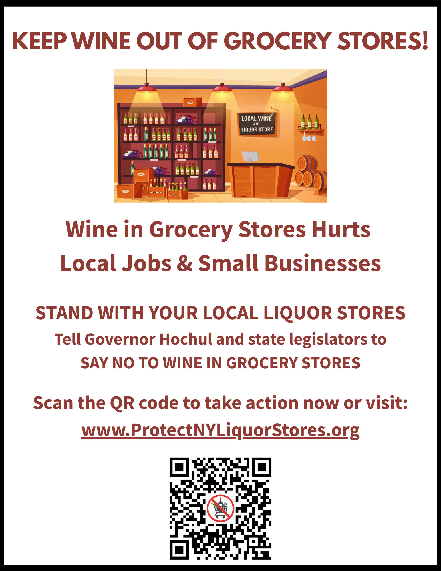Print out and post THIS FLYER in your liquor store for your employees, sales reps, customers, friends, and family. Use the QR Code to send letters to your legislators and Governor Hochul.